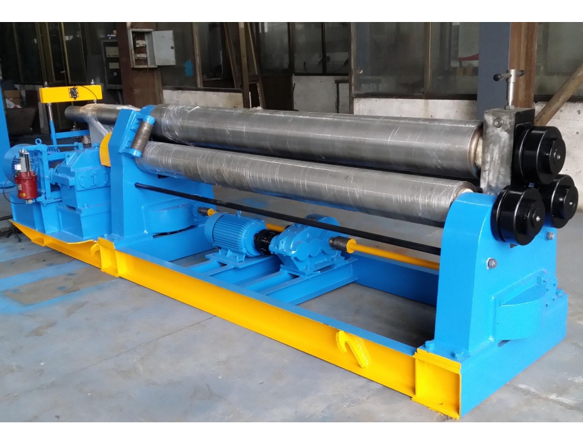 卷板機是將金屬板材卷彎成筒形、弧形或其它形狀工件的通用設備。三輥機械對稱式卷板機的下輥不能作水平移動,故工件端部的弧形必須經過預彎,預彎可在折彎機或廠方自制工裝完成。板料經兩端預彎后即開機卷筒。上輥升到板料可插進在三輥之間,插進板料后要注意板料兩側與輥子軸線的垂直性。可在自制的工作臺上作一導尺保證板料的正確位置。一切檢查完畢后,壓下上輥開始作業,上輥點動,使板料作垂直方向微量位移,板料經一個行程后開始彎曲,此時使下輥反轉。再次點動上輥向下微量位移,這樣周而復始,不斷來回輾轉直至筒口閉合。停車,升起上輥,壓下上輥尾端使上輥微微抬起,拔下翻倒座插銷,拉下翻倒座,制品即可從機上取下。