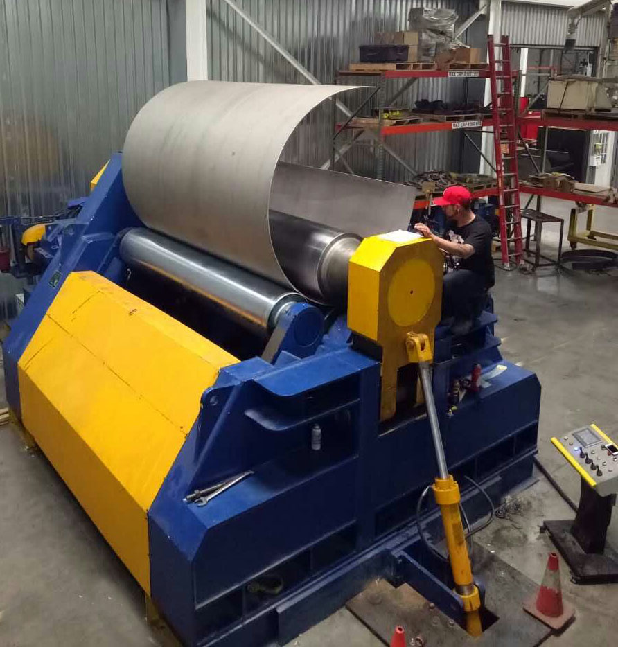 數(shù)控卷板機(jī)設(shè)備在進(jìn)行卷板時(shí)將板料放在上、下工作輥之間。上輥垂直升降,兩下輥?zhàn)鲂D(zhuǎn)運(yùn)動(dòng)且相對(duì)于上輥軸心面水平移動(dòng)。上輥下降時(shí),板材在上下工作輥之間發(fā)生塑性變形而彎曲。下輥連續(xù)旋轉(zhuǎn)通過板與輥之間的摩擦力帶動(dòng)鋼板進(jìn)、退,完成卷制。